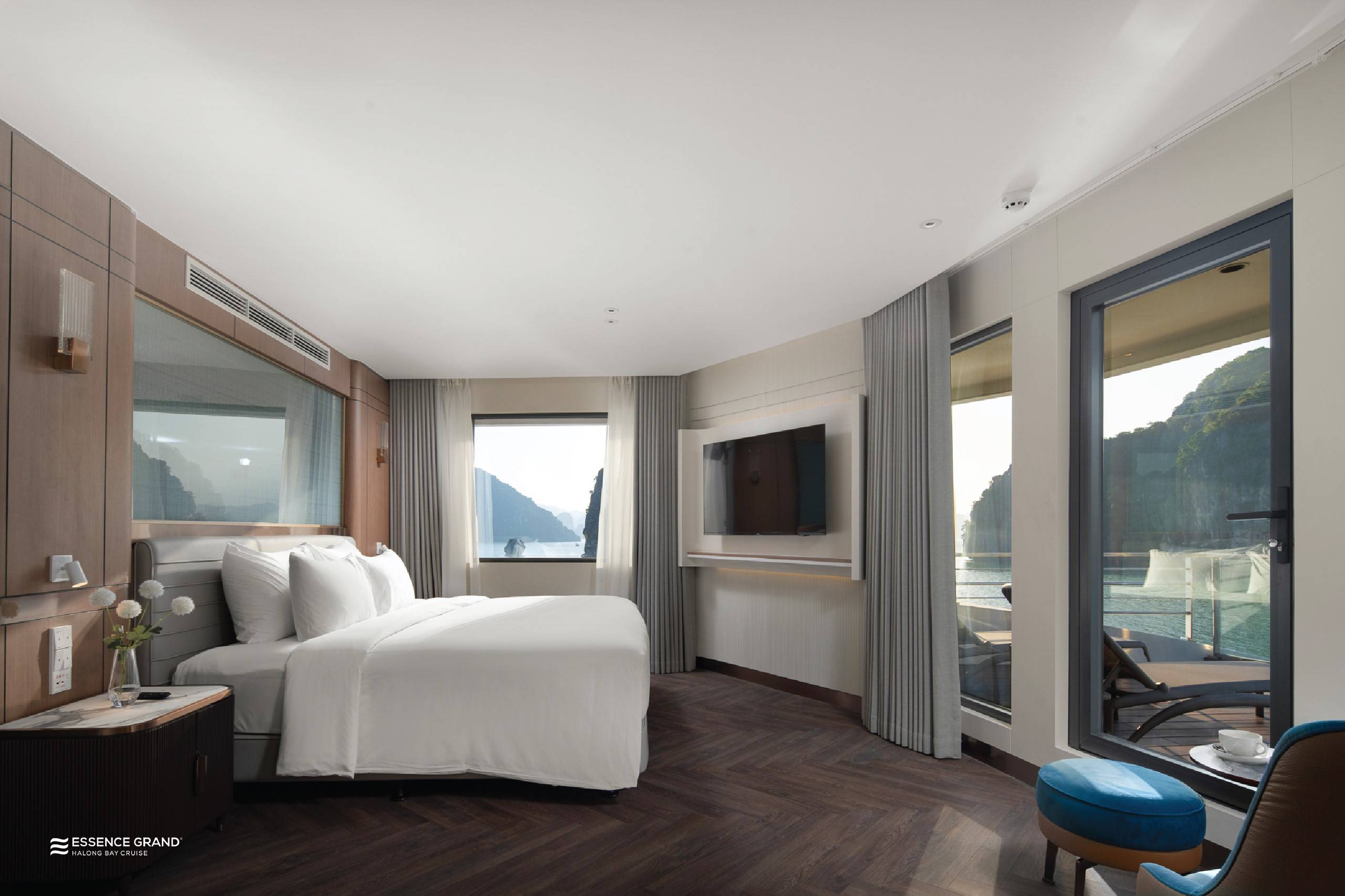 Design Style: Modern rooms have private balconies with panoramic views of Halong Bay.